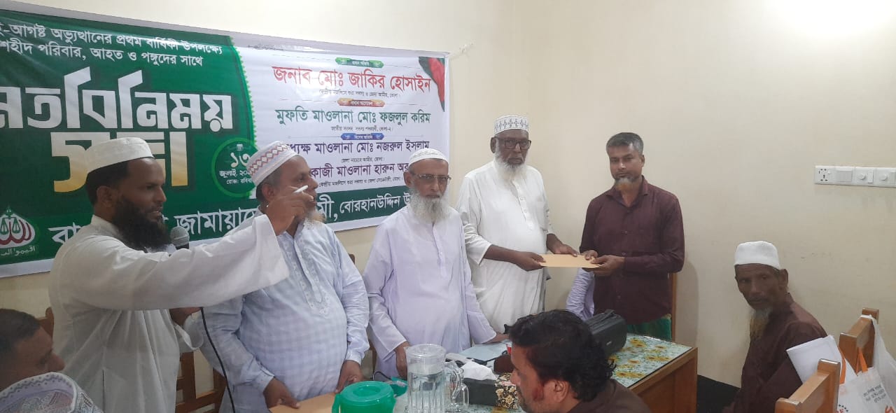 জুলাই-আগস্ট অভ্যুত্থানে শহীদ ও আহতদের পরিবারকে সহমর্মিতা জানিয়ে জামায়াতের মতবিনিময় সভামো. মিজানুর রহমান,বোরহানউদ্দিন (ভোলা):বাংলাদেশ জামায়াতে ইসলামী বোরহানউদ্দিন উপজেলা শাখার উদ্যোগে জুলাই-আগস্ট গণ-আন্দোলনের প্রথম বার্ষিকী উপলক্ষে শহীদ ও আহতদের পরিবারের সঙ্গে এক মতবিনিময় সভা অনুষ্ঠিত হয়েছে।রবিবার (১৩ জুলাই) উপজেলা জামায়াত কার্যালয়ে অনুষ্ঠিত সভায় উপস্থিত ছিলেন কেন্দ্রীয় ও স্থানীয় নেতৃবৃন্দ। শহীদ ও আহতদের পরিবারের প্রতি সহমর্মতা জানিয়ে এবং ন্যায়বিচারের সংগ্রামে একাত্মতা প্রকাশের উদ্দেশ্যেই এই সভার আয়োজন করা হয়।সভায় প্রধান অতিথি ছিলেন জামায়াতের কেন্দ্রীয় মজলিসে শূরা সদস্য ও ভোলা জেলা আমির মো. জাকির হোসাইন।প্রধান আলোচক ছিলেন ভোলা-২ আসনের জাতীয় সংসদ সদস্য পদপ্রার্থী মুফতি মো. ফজলুল করিম।বিশেষ অতিথি ছিলেন জেলা সেক্রেটারি ও কেন্দ্রীয় শূরা সদস্য কাজী মাওলানা হারুন অর রশিদ।সভায় আরও বক্তব্য রাখেন উপজেলা আমির অধ্যাপক মো. মাসুদুর রহমান, উপজেলা সেক্রেটারি মাওলানা আবুল কালাম আজাদ, নায়েবে আমির মাওলানা শফিউল্লাহসহ অন্যান্য স্থানীয় নেতৃবৃন্দ।সভায় জানানো হয়, ভোলা জেলার ৪৬ জন শহীদের প্রত্যেক পরিবারকে ইতোমধ্যে ২ লাখ ২০ হাজার টাকা করে সহায়তা প্রদান করা হয়েছে। গুরুতর আহত মহিউদ্দিনকে দেওয়া হয়েছে ১ লাখ ৮০ হাজার টাকা।এছাড়া, দৌলতখান ও বোরহানউদ্দিন উপজেলার শহীদ লিজা, ইয়াসিন, সোহেল, শাহীন, শাহজাহান, জামাল, নাহিদ, জাকির, রিয়াজ ও সুজন—এই ১০ শহীদের পরিবারকে অনুষ্ঠানে নগদ ১০ হাজার টাকা করে অনুদান প্রদান করা হয়।আহতদের মধ্যে মহিউদ্দিন, আবদুর রহিম ও মাসুম বিল্লাহ–এই তিনজনের পরিবারকেও সম্মানী ও খোঁজখবর নেওয়ার ব্যবস্থা করা হয়।অনুষ্ঠানটি পরিচালনা করেন বোরহানউদ্দিন উপজেলা জামায়াতের দায়িত্বশীল নেতৃবৃন্দ।স্থানীয় পর্যায়ে এই মতবিনিময় সভাটি গণআন্দোলনের স্মৃতিচারণ ও দুঃখ ভারাক্রান্ত পরিবারগুলোর প্রতি সহানুভূতির প্রকাশ হিসেবে এলাকাবাসীর মধ্যে আলোচিত হয়েছে।-